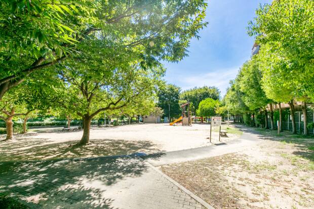 カラフルな複合遊具や健康遊具、砂場のある公園。木陰が多く、親子でゆっくり過ごすことができます。トイレや手洗い場、ベンチも設置されています。