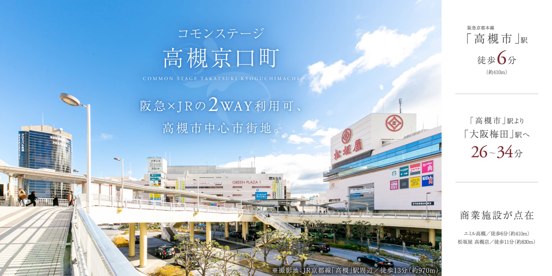 阪急京都本線「高槻市」駅から「大阪梅田」駅・「烏丸」駅へダイレクトアクセスが可能。