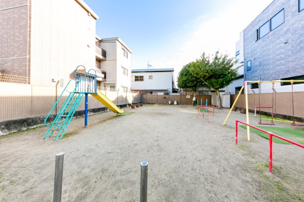 小さなお子様と一緒に気軽にお散歩に出かけられる距離です。滑り台やブランコが設置されています。出入口が一箇所なので、安全に見守れそうです。
