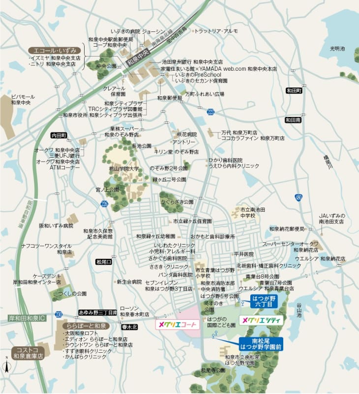 小中一貫校まで徒歩8分圏内、ららぽーと・コストコが車で4分圏内、最寄駅「和泉中央」駅周辺には多彩な商業施設が揃う、利便性に優れた好環境です。