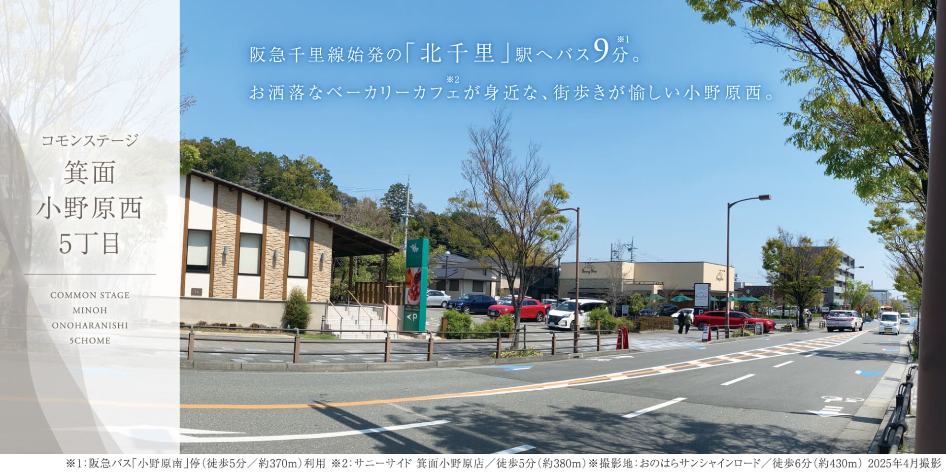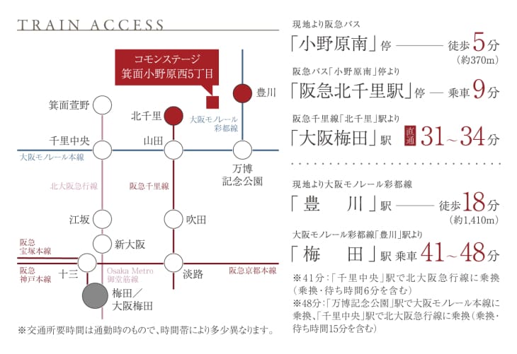 徒歩5分の阪急バス「小野原南」停から、阪急千里線始発の「北千里」駅へバス乗車9分。