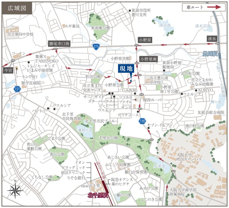 大阪モノレール彩都線「豊川」駅も徒歩圏にあり、行先や天候によってアクセス方法を選べます。