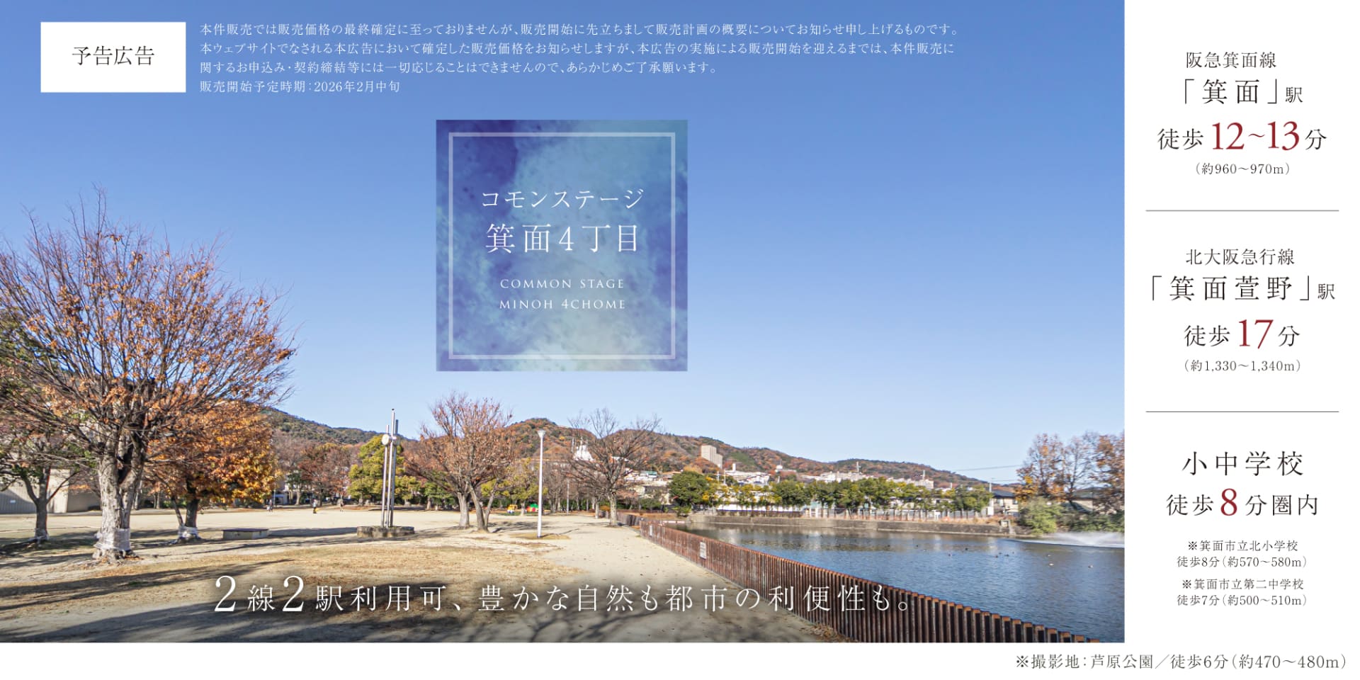《予告広告》「箕面」駅へ徒歩12~13分。始発駅のため、通勤の負担軽減やお子様とのお出かけにも嬉しい立地。ゆとりある快適な暮らしをサポートします。