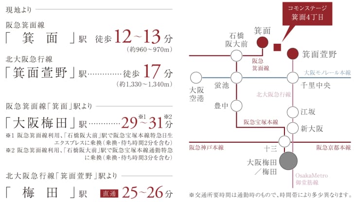 阪急箕面線「箕面」駅へ徒歩12~13分、北大阪急行線「箕面萱野」駅へ徒歩17分。