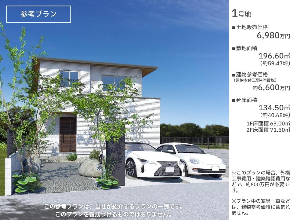 土地価格/6980万円、敷地面積/196.60㎡(約59.47坪)。床面積/1階63.00㎡・2階71.50㎡、延床面積/134.50㎡(約40.68坪)。