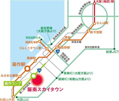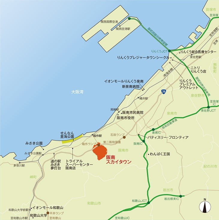 国道26号線からは第二阪和国道が整備されており、大阪府南部と和歌山県北部をつないでいます。 阪南スカイタウンの周辺エリアでは お車で、せんなん里海公園へ約10分、道の駅 みさき 夢灯台へ約13分です。