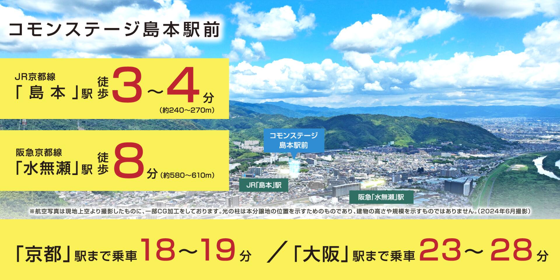 徒歩3~4分のJR「島本」駅から、「京都」駅へ18~19分、「大阪」駅へ23~28分と、主要都市へ快適にアクセス可能。