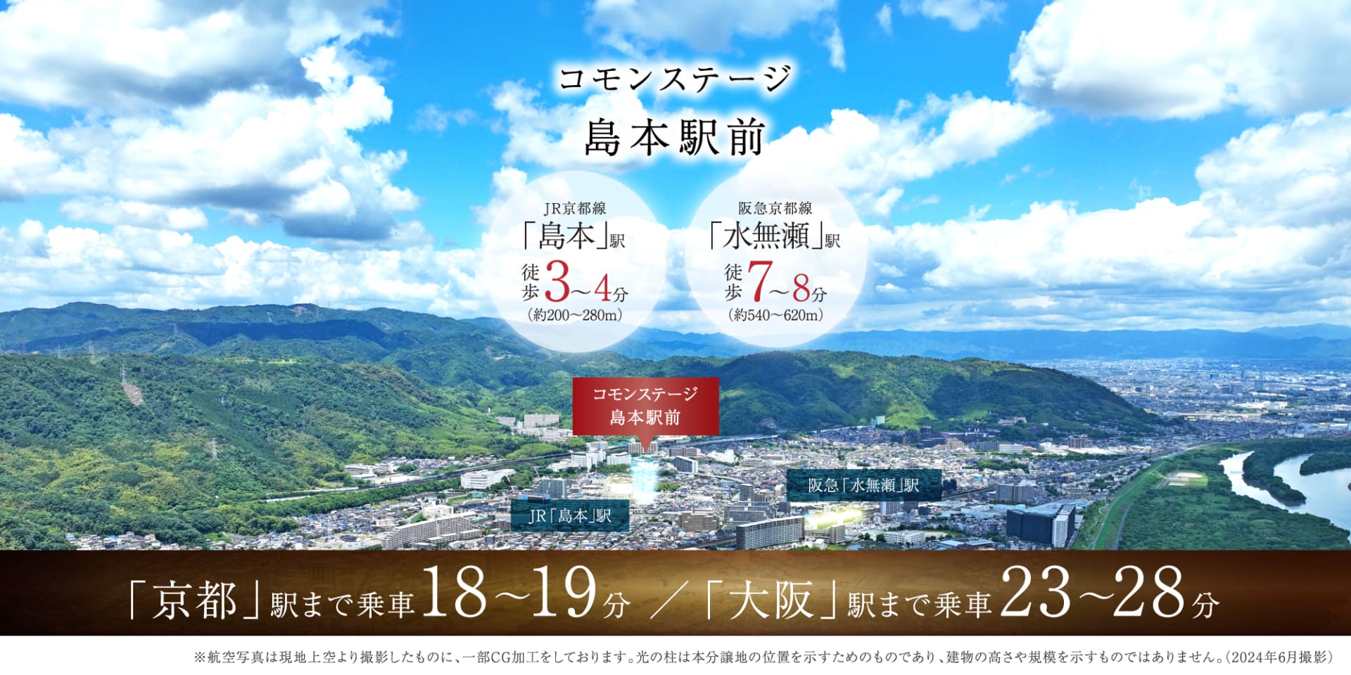 徒歩3~4分のJR「島本」駅から、「京都」駅へ18~19分、「大阪」駅へ23~28分と、主要都市へ快適にアクセス可能。