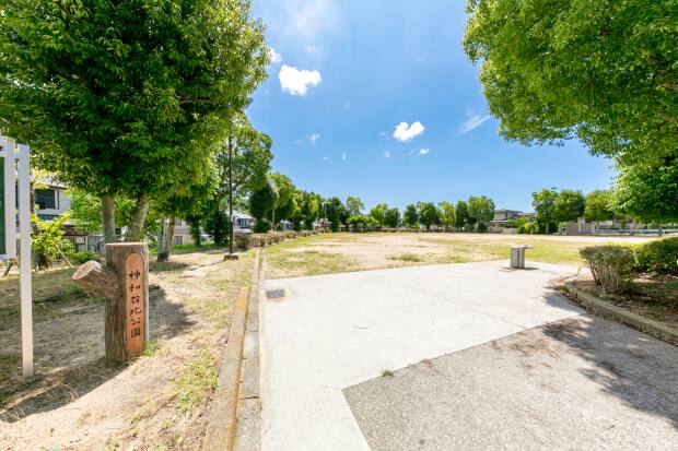 住宅街の中にある公園です。周囲を木が取り囲み、ベンチも設置されているので、散歩やお子様の遊びの合間にゆったりと過ごせます。