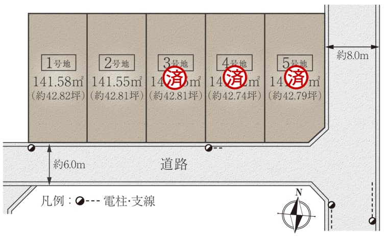 42坪超の2区画を分譲中。建物・駐車スペースを配置しやすい縦長の敷地です。