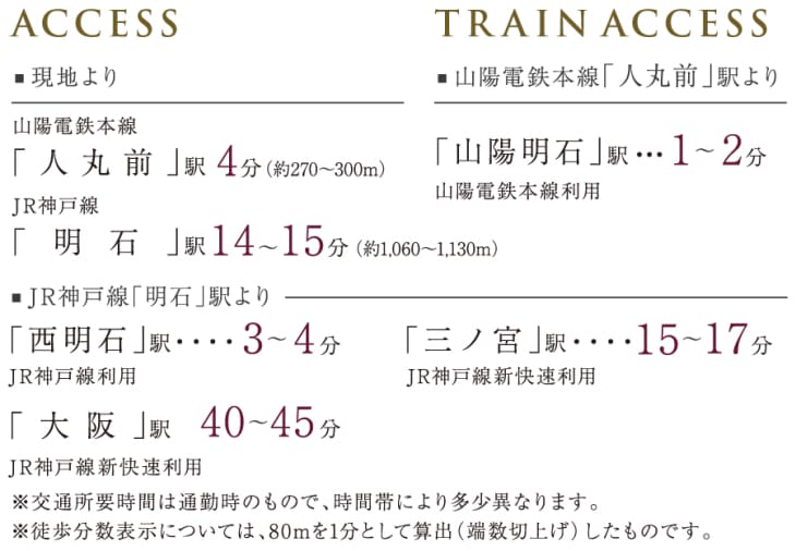 JR神戸線「明石」駅から「西明石」駅へ3~4分、「三ノ宮」駅へ15~17分。