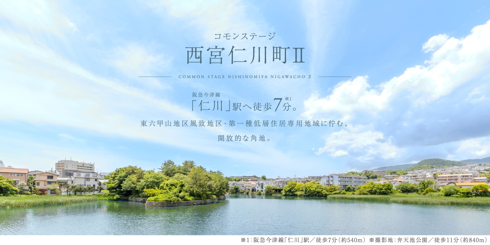 仁川公園へ徒歩1分、小学校へ徒歩12分、中学校へ徒歩4分と、子育てにもおすすめの立地。