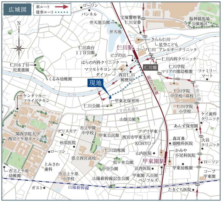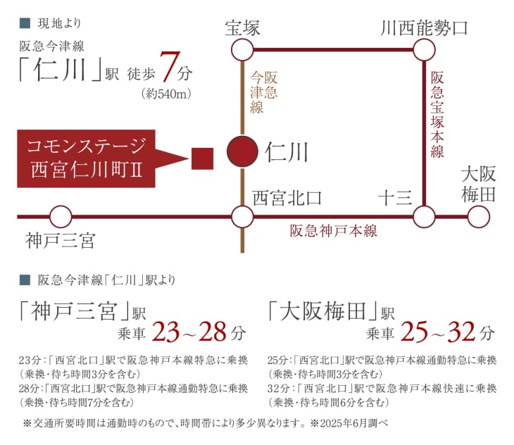 阪急今津線「仁川」駅から「神戸三宮」駅まで23~28分、「大阪梅田」駅へは25~32分。