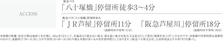 「八十塚橋」停留所へ徒歩3~4分(約180~290m)。バス停留所が身近にあり、悪天候や猛暑日も快適に移動できます。