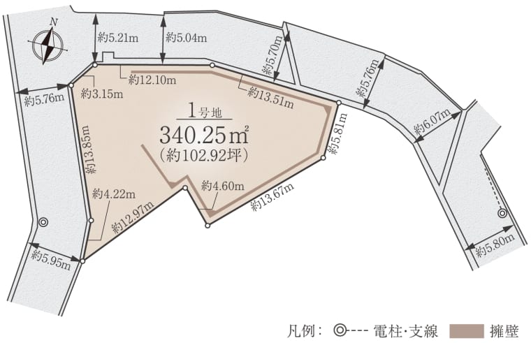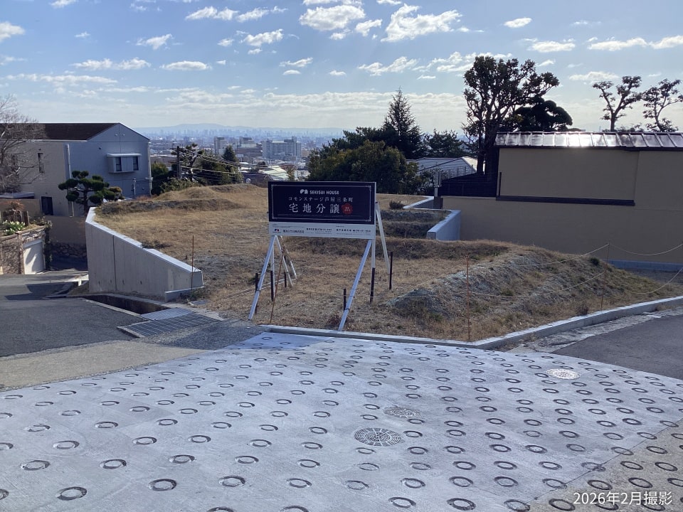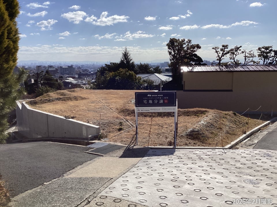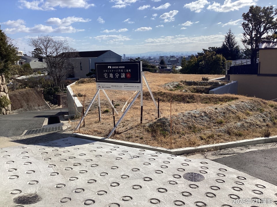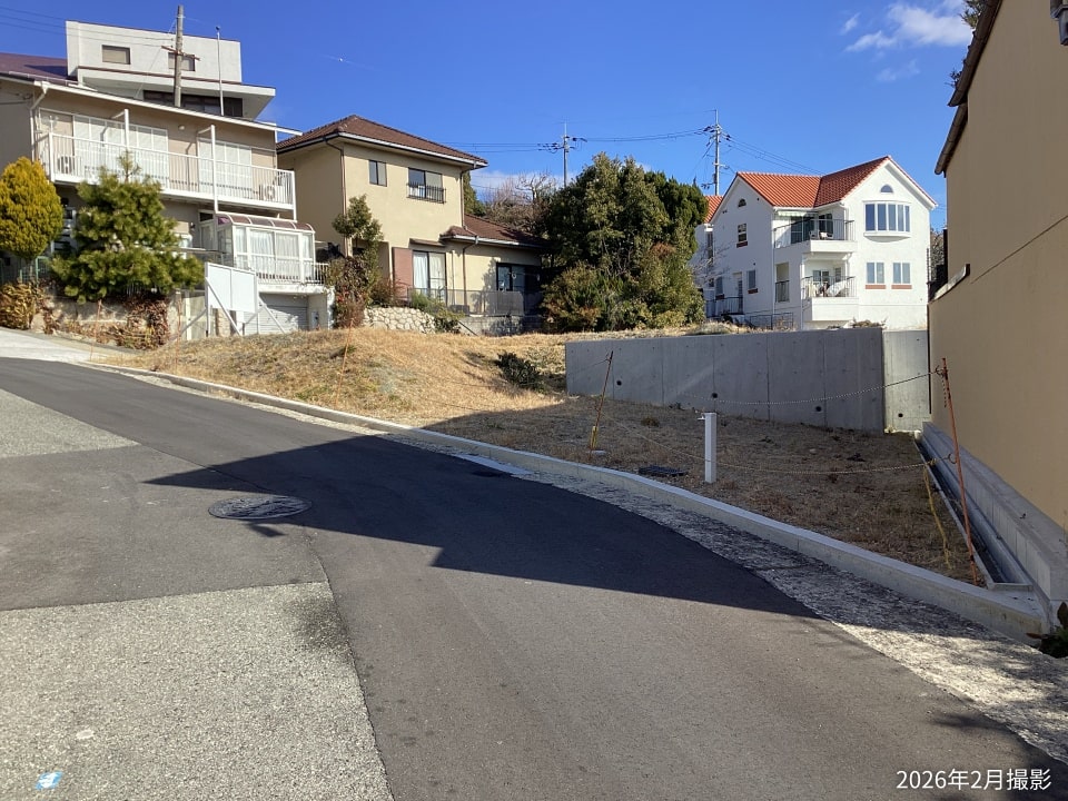 広々とした102坪超の敷地です。前面道路の幅員は、北・西ともに5m以上。間口も広いため、車の出入庫をスムーズに行えそうです。/2026年2月撮影