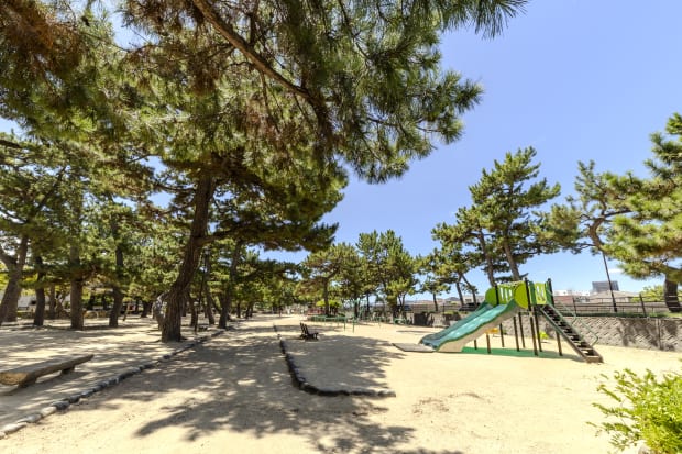 芦屋川沿いにある公園。ブランコ、滑り台などの遊具やテニスコート(有料)があります。樹齢150年余のクロマツが生い茂り、自然を感じながら散策も楽しめそうです。