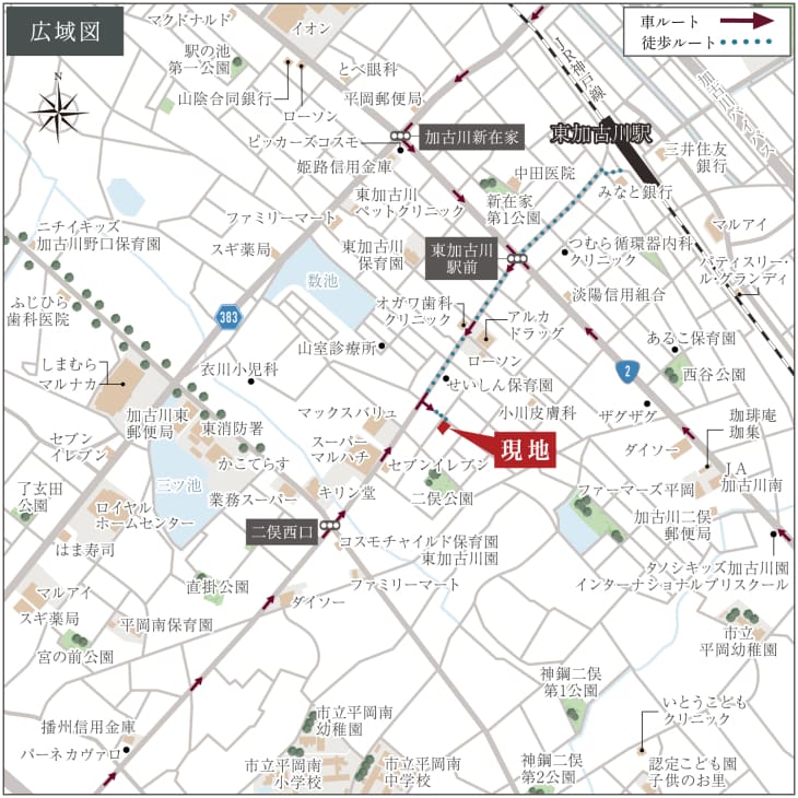 「東加古川」駅まではフラットな道のりのため、毎日の通勤やベビーカーを利用される際も移動がスムーズです。