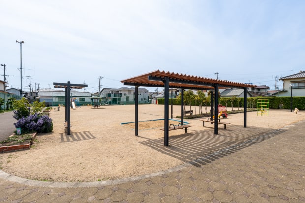 遊具が設置された広々とした公園。ひとときの休息にも気軽に利用できます。園路はアップダウンがほとんどなく、お年寄りや小さなお子様も、お散歩を楽しむことができます。