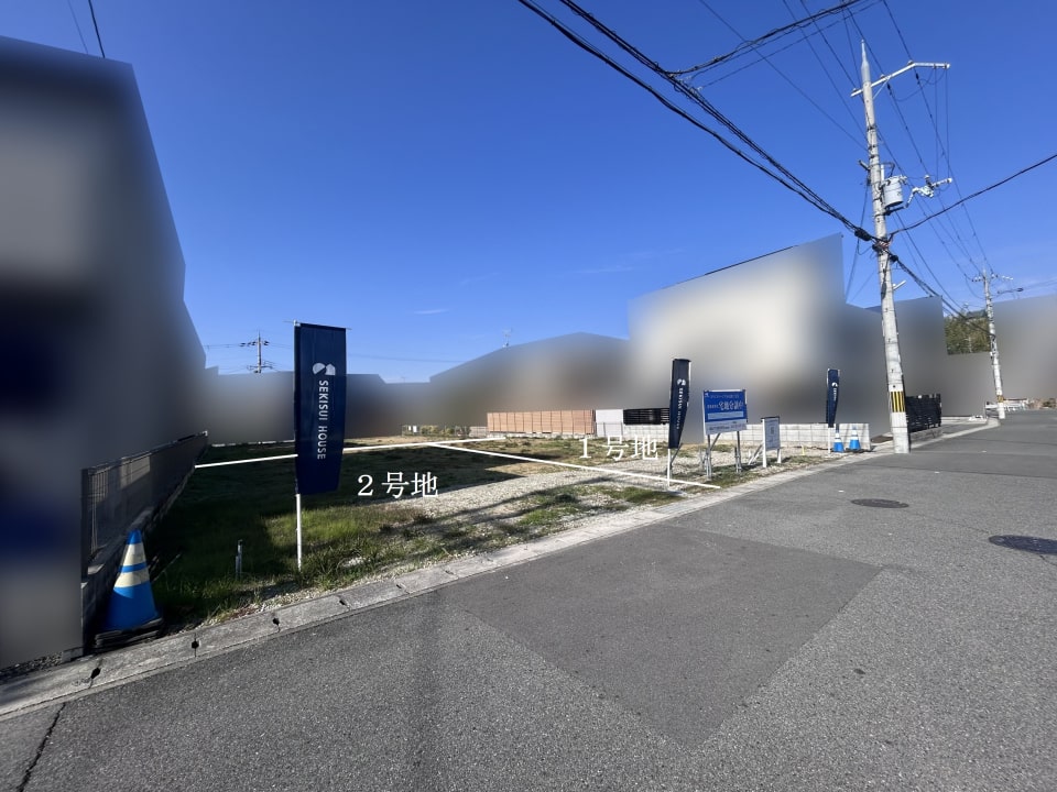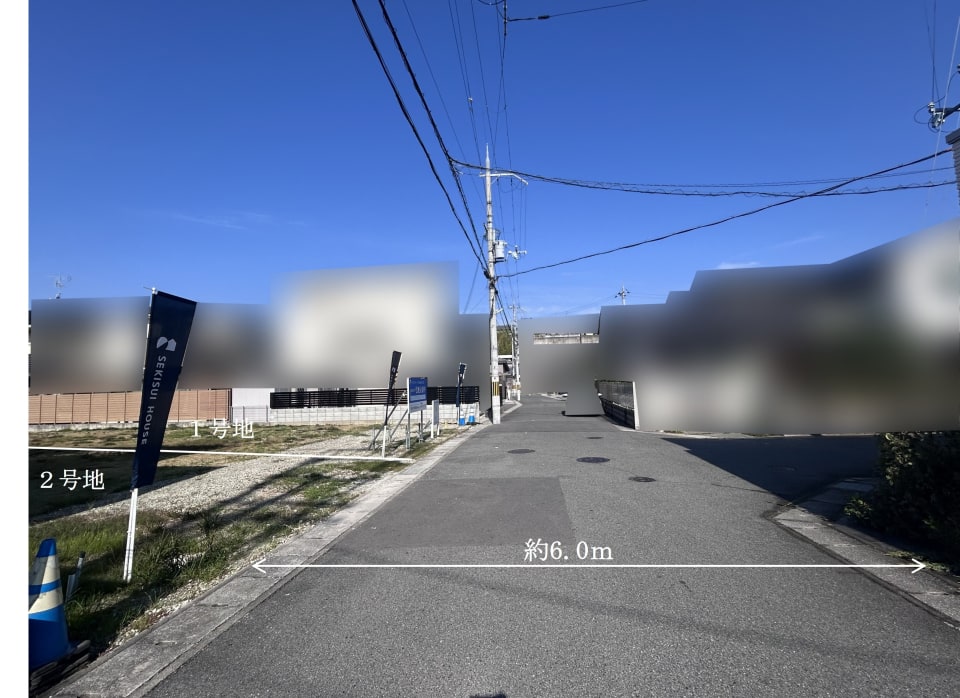 東側前面道路北側から南西に向かって1号地、2号地を望む。(2025年11月撮影)