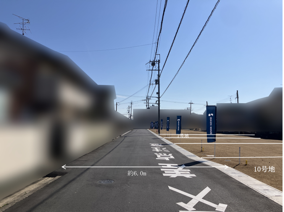 前面道路から分譲地を望んだ写真です。道路幅員は約6mあり