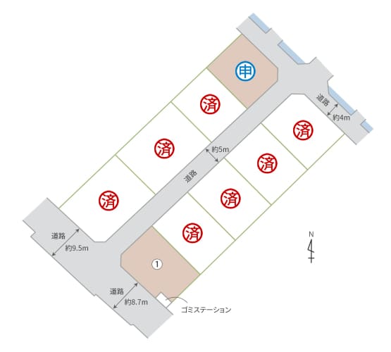 周辺には保育園や小中学校もあるので子育て世代にもおすすめのエリアです。全9区画の分譲地で、統一感のある街並みを形成します。
