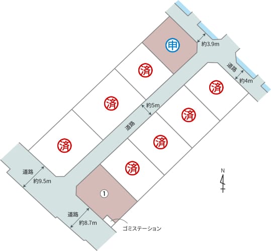 周辺には保育園や小中学校もあるので子育て世代にもおすすめのエリアです。全9区画の分譲地で、統一感のある街並みを形成します。