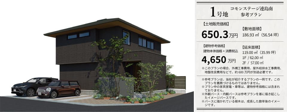 【1号地参考プラン:外構付き平面図】 建物参考価格(建物本体価格+消費税込) 約4,650万円(このプランの場合、外構工事費用、屋外給排水工事費用、地盤改良費用などで、約600万円が別途必要です。)