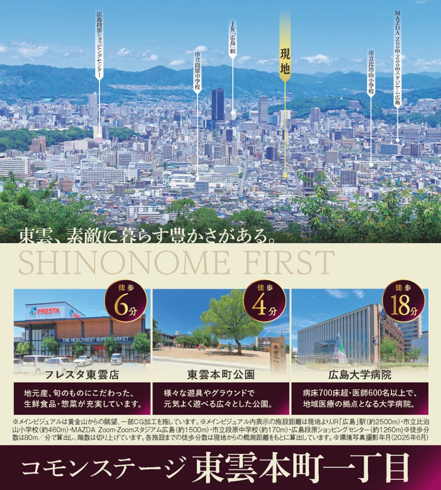 再開発で変貌を遂げる広島駅へ路線バスで気軽にアクセスできる立地。国道2号線、広島高速2号線東雲インターに近く、ビジネスやレジャーにマイカーでのお出かけもスムーズです。