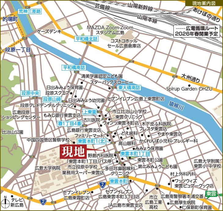 「東雲本町1丁目」バス停へ徒歩3分。広島駅へバス便で9分。