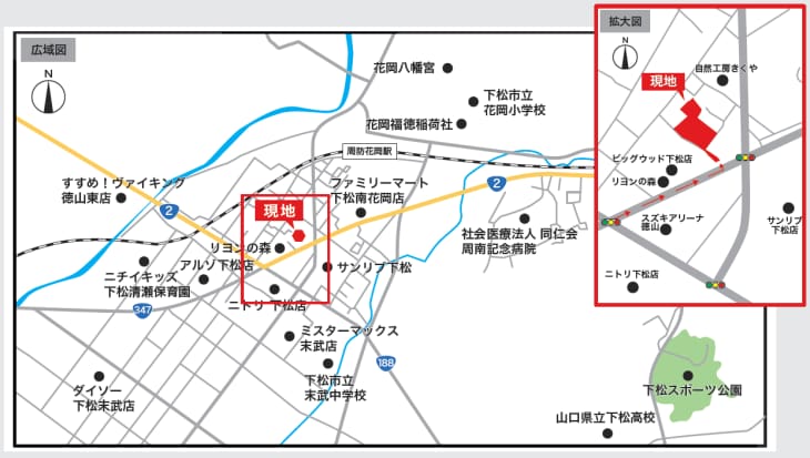 下松市南花岡にて分譲中!サンリブ下松店まで徒歩8分(約600m)と日々のお買い物に便利な立地です。