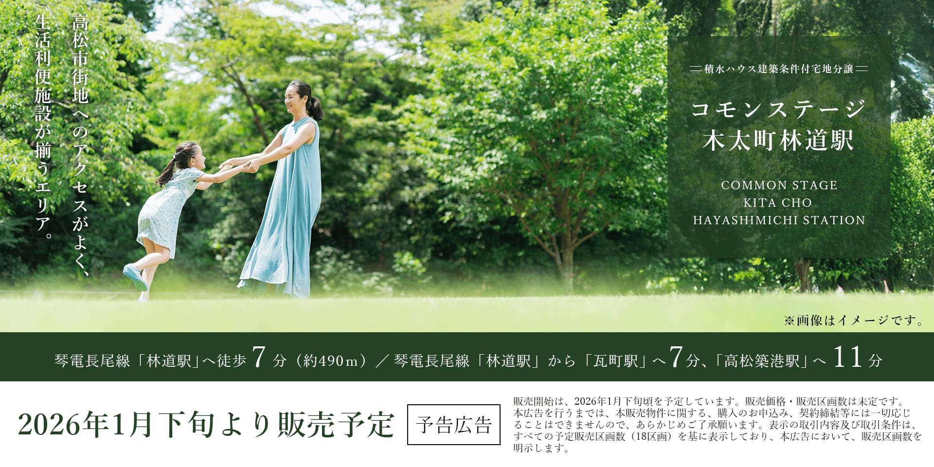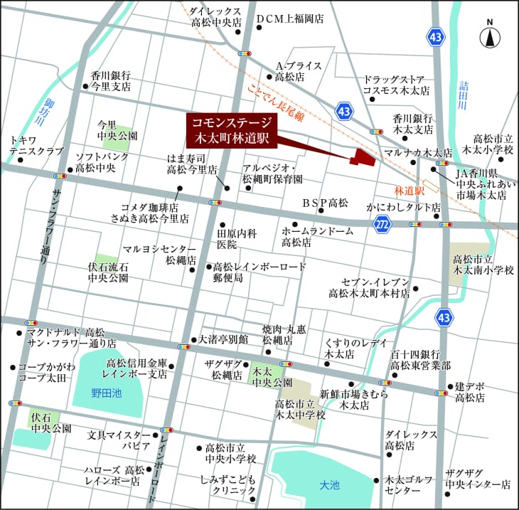 琴電長尾線「林道駅」から徒歩約7分(約490m)(最長)。高松築港方面に平日54本、土日祝は41本。高松市街地へのアクセスも良く、通勤・通学に利用しやすい立地に位置しております。