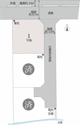 約69坪の敷地です。 分譲地北側の接道は、車道約5.7m、歩道3.0mの松山市道です。
