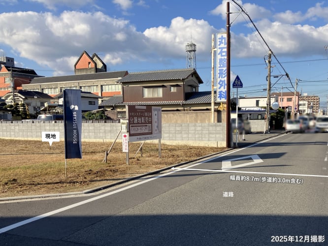 約69坪の敷地です。 分譲地北側の接道は、車道約5.7m、歩道3.0mの松山市道です。