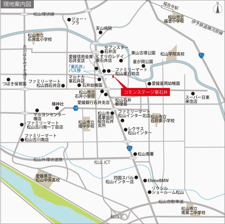 国道33号線、国道11号線にアクセスしやすい分譲地。 マルナカ東石井店まで350m(徒歩5分最長)、伊予鉄バス「東石井」バス停まで300m(徒歩4分最長)