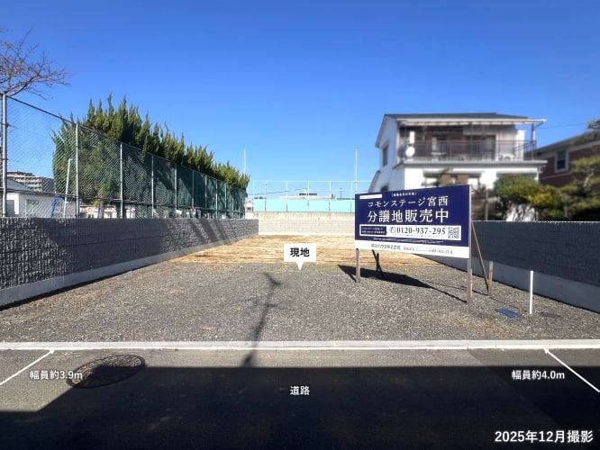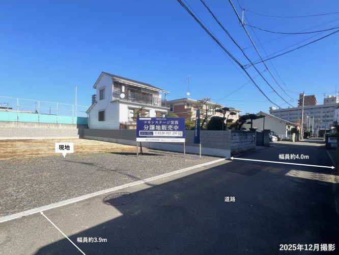 ![]() 南側道路からの現地写真② 南側道路幅員約3.9m~約4.0mです。 最小幅員は約3.9mですが、セットバックの必要はありません。 |
