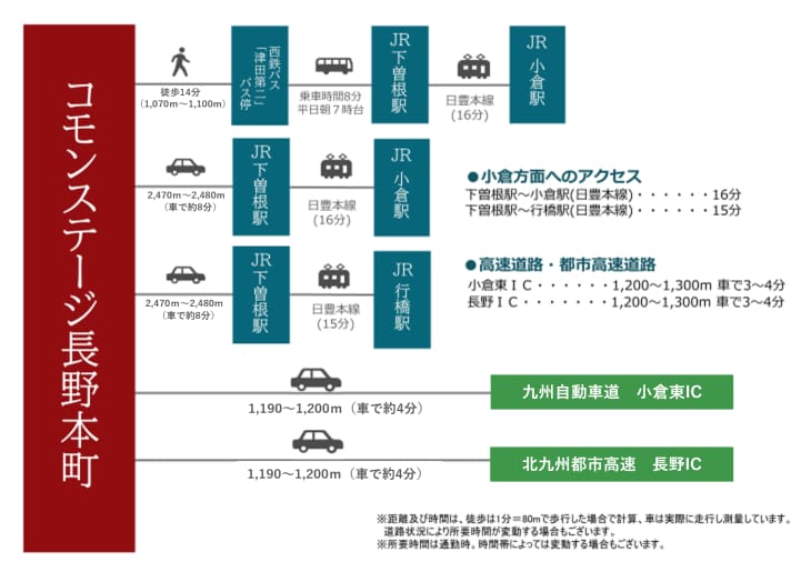 長野津田の全12区画の新興住宅地。九州自動車道小倉東インターチェンジ(1,190~1,200m)や都市高速道路長野出入口(1,190~1,200m)、国道10号線(620~630m)に近接する、交通利便性の高いエリアに位置し、北九州の土地区画整理事業の一環として街整備が行われております。