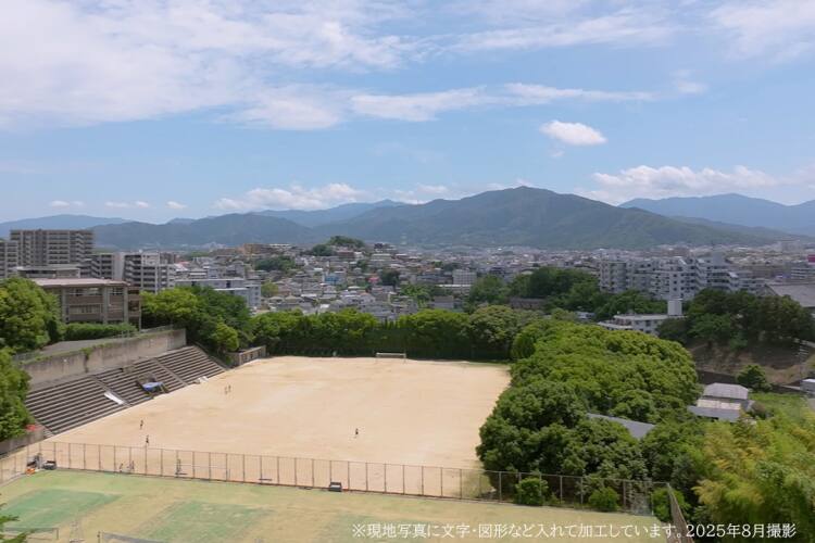 ![]() 高台地からの景色を愉しむ。 南側に広がる上智福岡中高のグラウンドと、山並みを望む高台分譲地(標高55m超)。開放感あふれるロケーションで高台ならではの眺望と、自然に囲まれた落ち着いた環境が特徴の土地です。写真は現地上空写真です。 |