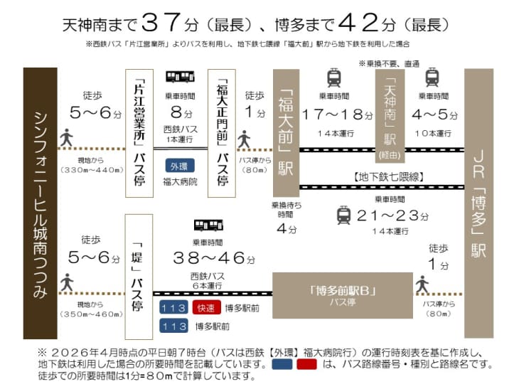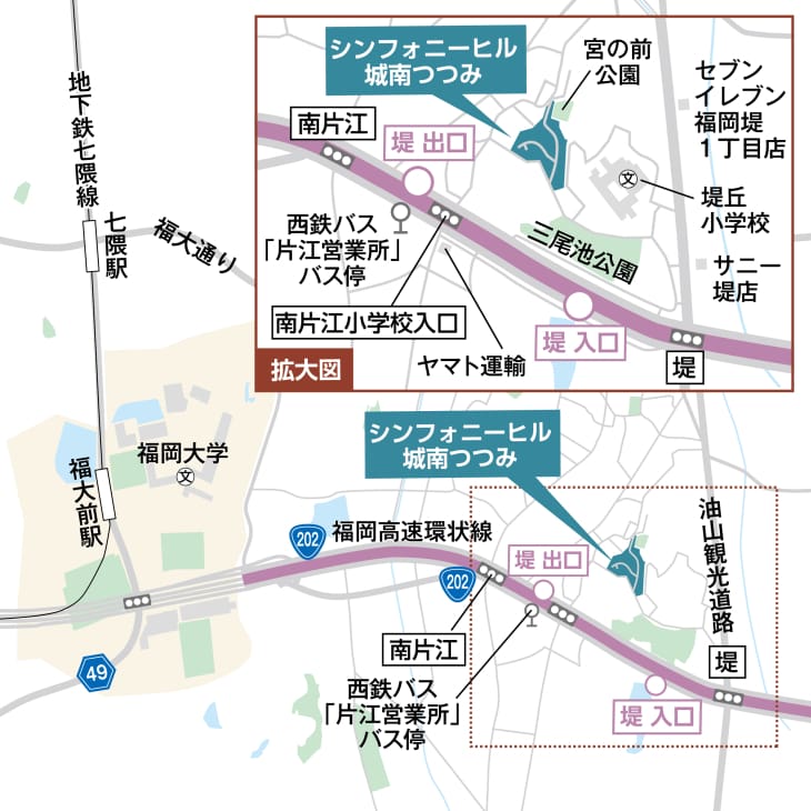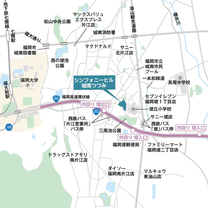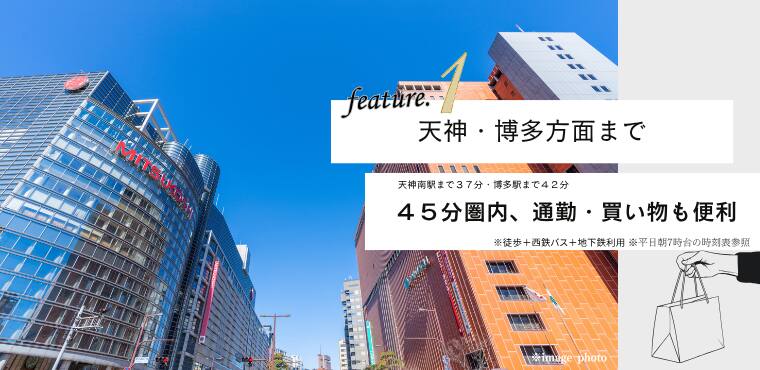 ![]() 天神・博多方面へのアクセスがスムーズ 最寄バス停「片江営業所」からは、天神・博多方面への複数の路線があり福岡市地下鉄七隈線の福大前駅に到着するほか、都心部へスムーズにアクセスできるエリアです。 |