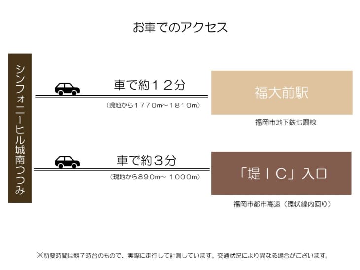 ![]() 利用しやすい都市高速 福岡都市高速「堤インター」へのスムーズなアクセスを活かし、都心方面・郊外方面ともにお車での軽快な移動が可能な立地です。 |