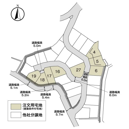 ※二段構成の段差部は擁壁で土留めし駐車場及びアプローチ部分の4号地:53.92㎡、5号地:62.13㎡が含まれます。4・5号地については、宅地内に高低差があり、擁壁及び階段によって造成された2段敷地となります。土地面積内に擁壁部分が、17号地:19.71㎡、18号地土:40.56㎡、19号地31.17㎡が含まれます。