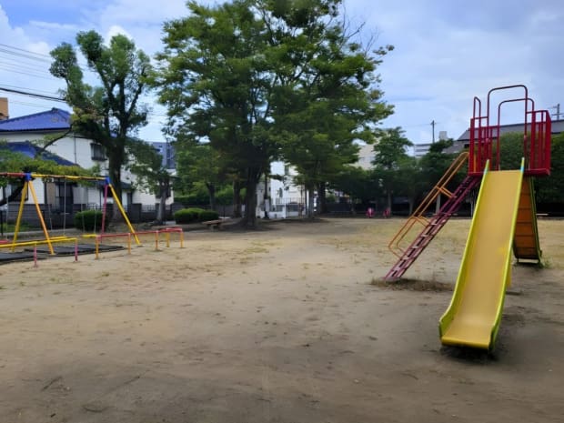 大きな木々に囲まれていて、子どもたちが走り回れる広いスペースがあります。遊具や砂場も備わっています。(2025年9月撮影)