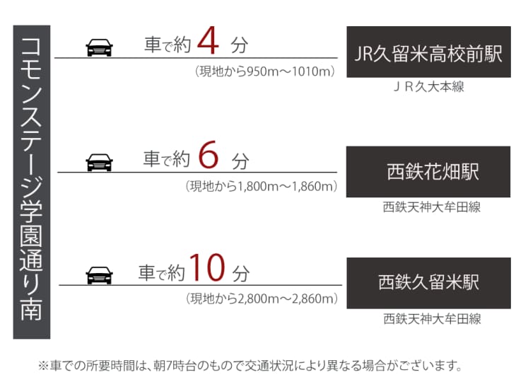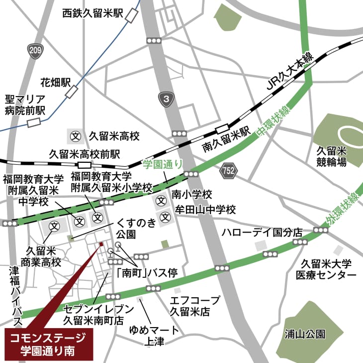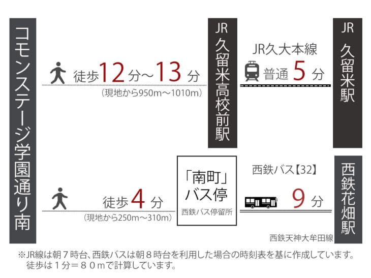 ![]() JR駅:徒歩13分(最長)と西鉄駅もバス利用で13分 JR久大本線「久留米高校前」駅(現地から950m~1010m)、西鉄「南町」停留所まで徒歩4分(最長)、「西鉄バス」に乗車、西鉄天神大牟田線「花畑」駅まで9分 |