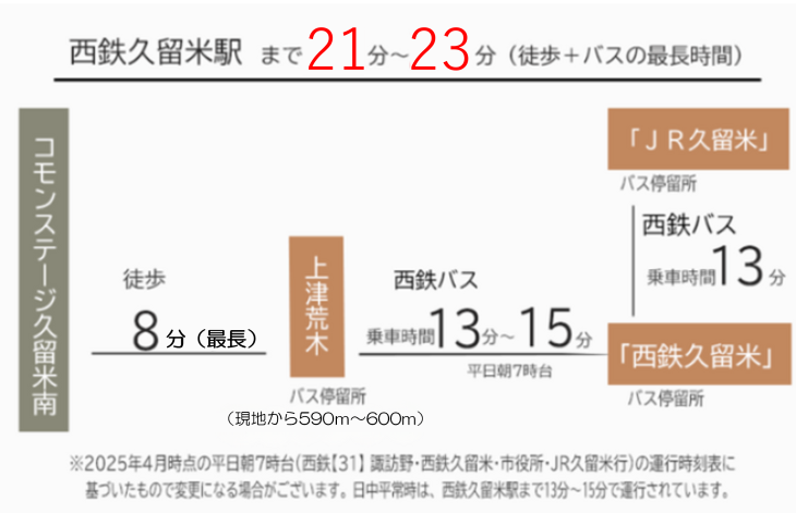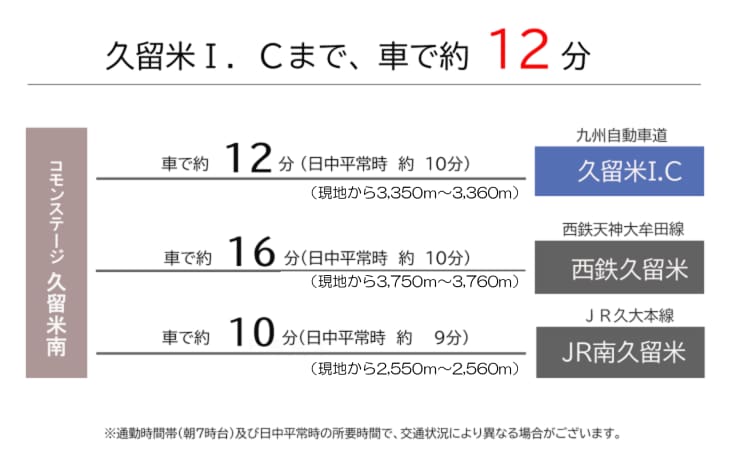 片道2車線の外環状線を利用し久留米I.Cまで車で約12分。通勤や買い物、旅行に便利な立地です。