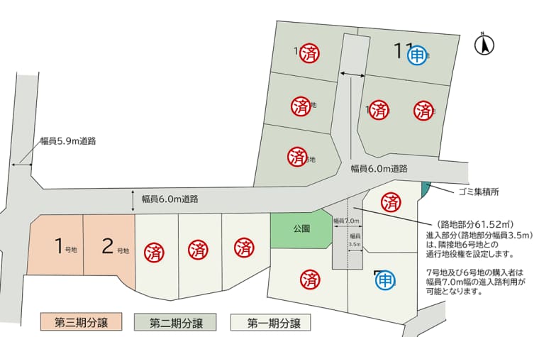 7号地の路地部分(61.52㎡)及び西側隣地の路地部分(58.41㎡)に双方の通行地役権の設定がございます。
