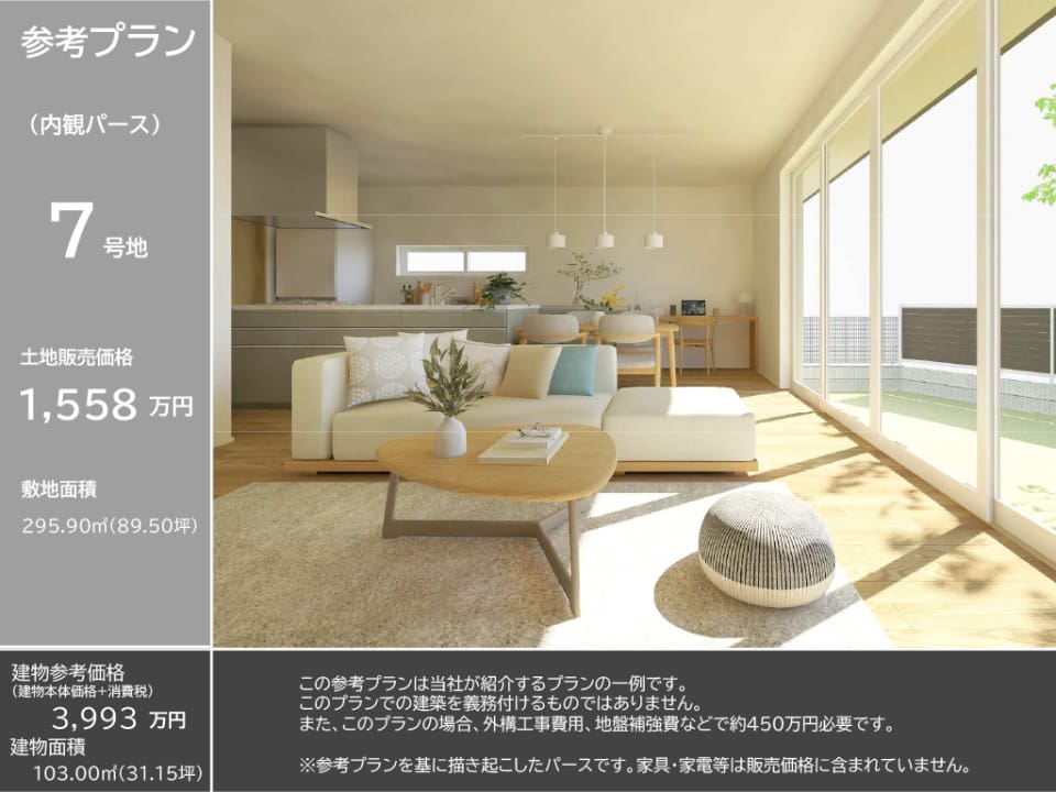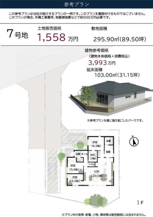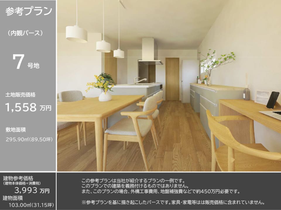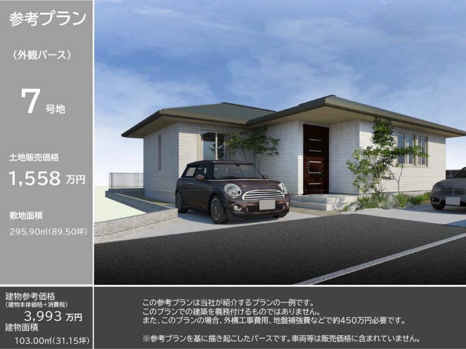 7号地 土地89.50坪、販売価格1,558万円(坪17.5万円)※幅員3.5mの路地部分(61.52㎡)に通行地役権の設定があります。