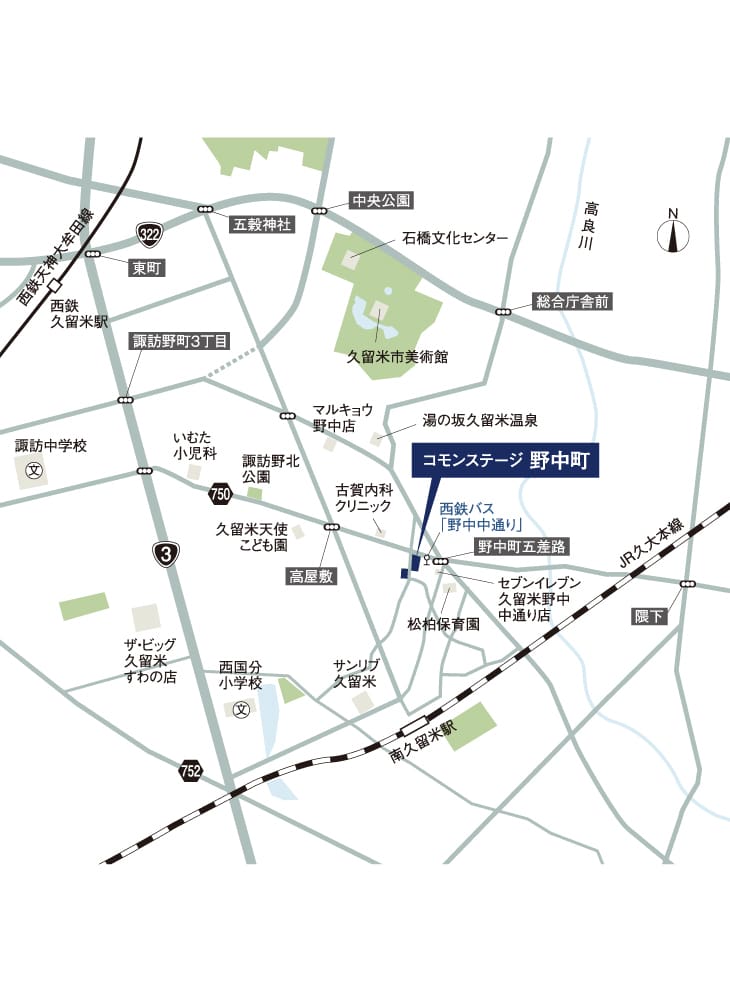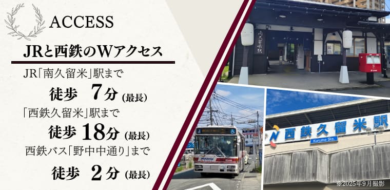 JR「南久留米」駅まで徒歩6分~7分(420m~500m)、「西鉄久留米」駅まで徒歩17分~18分(1320m~1400m)、西鉄バス「野中中通り」バス停まで徒歩1~2分(30m~110m)で通勤・通学・ショッピングにも便利です。