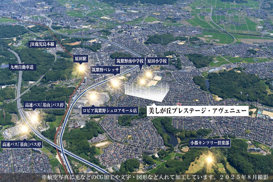 徒歩10分圏内には、スーパーをはじめ学校もあり通学も安心です。最寄り駅から福岡都市部まで電車で直通でアクセスも良好です。※航空写真は現地から南4kmの上空より撮影しています。