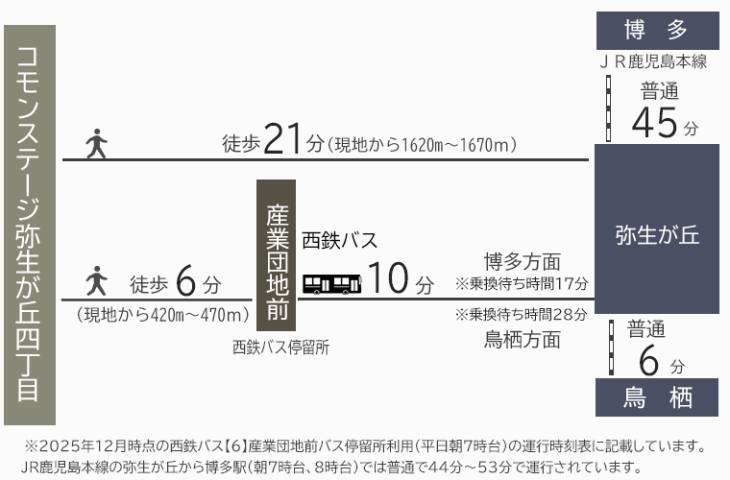 乗換待ち時間は、バス利用の弥生が丘駅7:49着を利用した場合のものです。平日の朝7時台の時刻表を基に作成し、距離及び時間は1分=80mで歩行した場合で計算しています。(2025年12月時点)