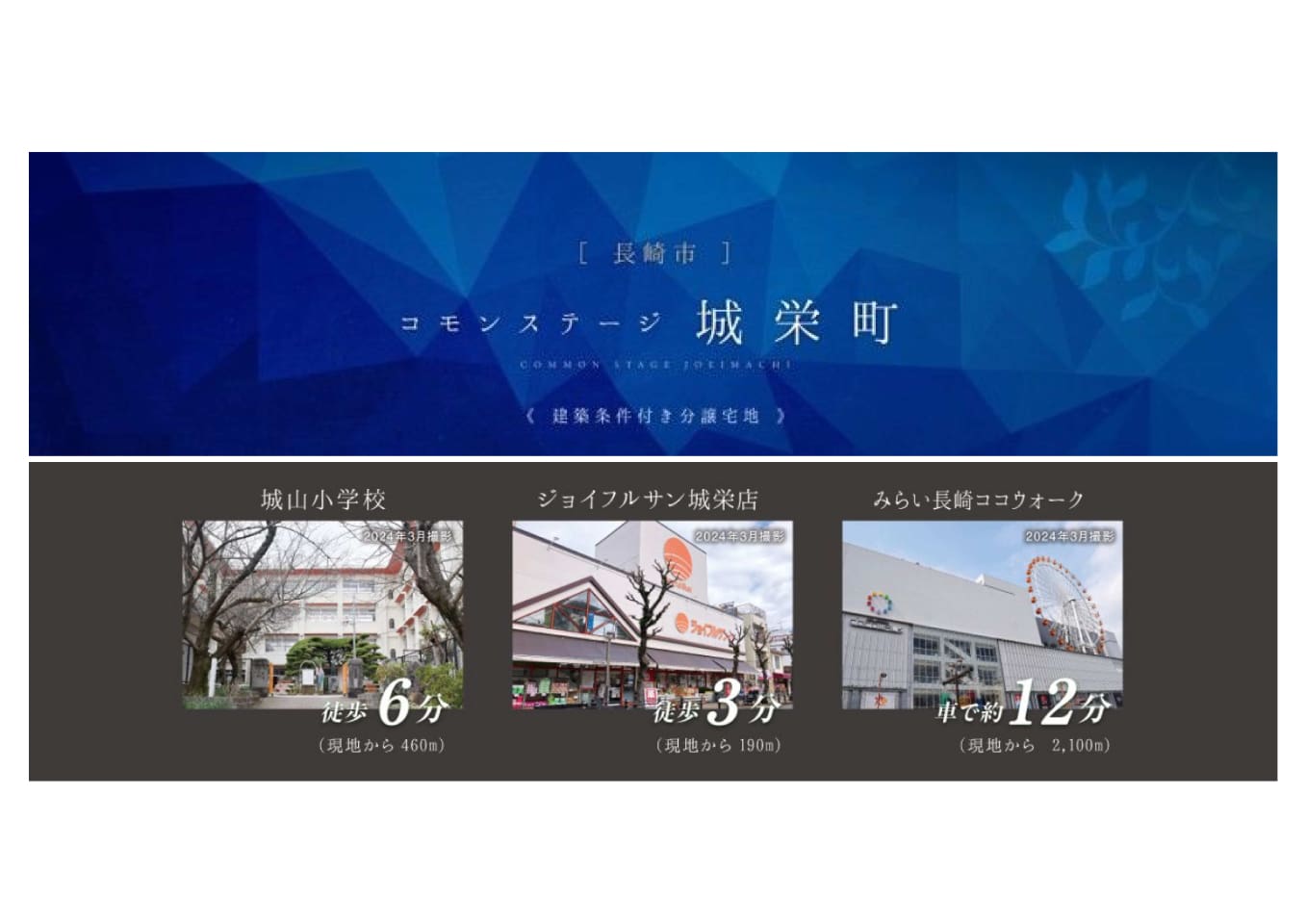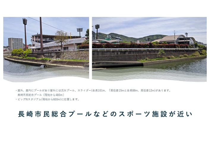 徒歩10分圏内に城山小学校やジョイフルサン城栄店があり、生活利便性に優れた環境です。さらに、浦上川を渡った対岸には、長崎市民総合プール(約480m)、長崎ビッグNスタジアム(約600m)、陸上競技場(約550m)などの公共施設も充実しており、静かで落ち着いた住環境が広がっています。