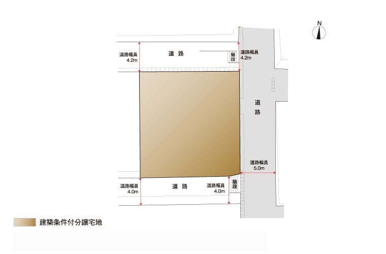 北側は階段とスロープのついた長崎市道で幅員4.2 m道路(コンクリート舗装)